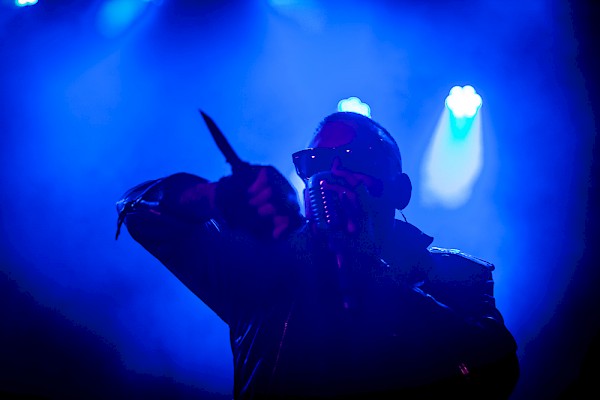 After a dreamy performance by Force Publique, Prayers took the stage, Seyer walking tall with a forceful gate and Parley trudging behind him, shoulders hunched forward, almost as if in anticipation of the MPC5000 to be placed in front of him. The theater darkened and Parley kicked into gear, triggering a wave of white noise that rippled through the audience. The first beat ignited a quick flash of strobes that were trapped in the smoke hanging in the air. Seyer grasped a retro-style microphone with his gloved hands, uttering a few choice, cryptic lines before launching into the set, starting with “Blood On The Blade,” and causing the crowd to go wild. It was surprising to me exactly how entertaining such a basic setup of a MPC and microphone paired with passionate delivery and inventive theatrics could be. At times Seyer would whip out a knife, opening and closing the blade while physically mimicking his lyrics before throwing the mic forward and whipping it back with a black scarf that was tied around the stand. The formula of the performance was spectacular in its simplicity, and one of the most captivating I’ve seen in years.