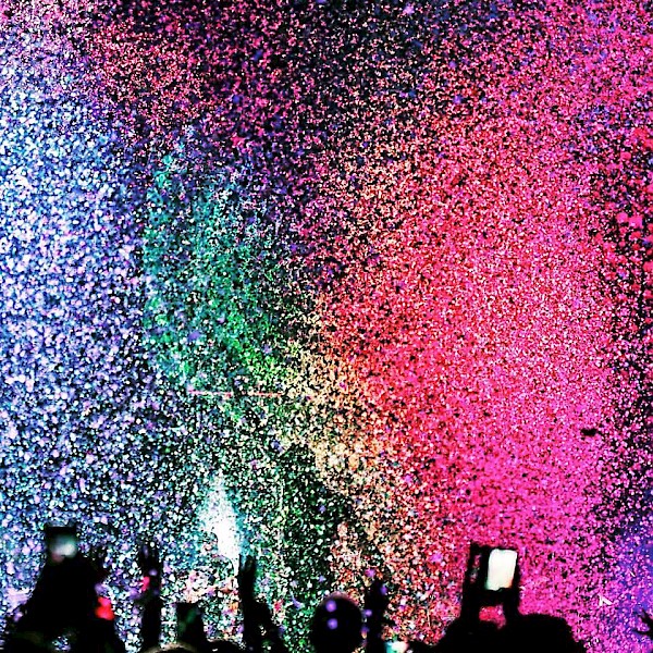 Confetti and Xylobands have become hallmarks of Coldplay shows, as seen in this photo from their show in Edmonton, Alberta, earlier in their current tourColor and music burst forth as the band started into the title track from their latest album, A Head Full of Dreams. Chris Martin became the embodiment of their music as he performed, and the beautifully complex production let him give his all. As he jumped about the stage, the room exploded in a rainbow of confetti upon the first chorus. Every member of the crowd became part of the light show as the Xylobands upon their wrists twinkled and sparkled to the music.
