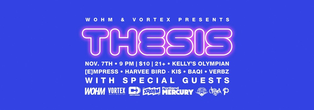 In conjunction with We Out Here Magazine, Vortex is proud to present The Thesis. The monthly hip-hop showcase known for packing out the place returns on First Thursday with another blazing bill of local beat slingers and rhyme slayers. This month's lineup also includes Thesis freshman BAQI and special guests!