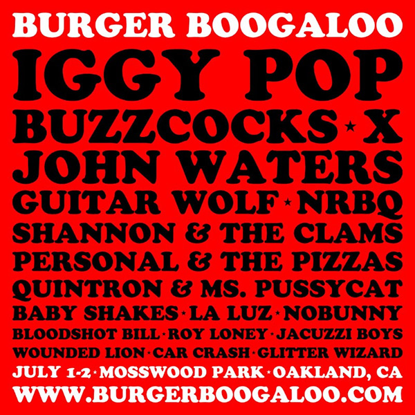 Hosted by John Waters, Burger Boogaloo returns for its five-year anniversary party at Oakland's Mosswood Park. Presented by Burger Records and KALX, two-day passes are $129 (VIP $199) while Saturday GA is $99 and Sunday is $69.